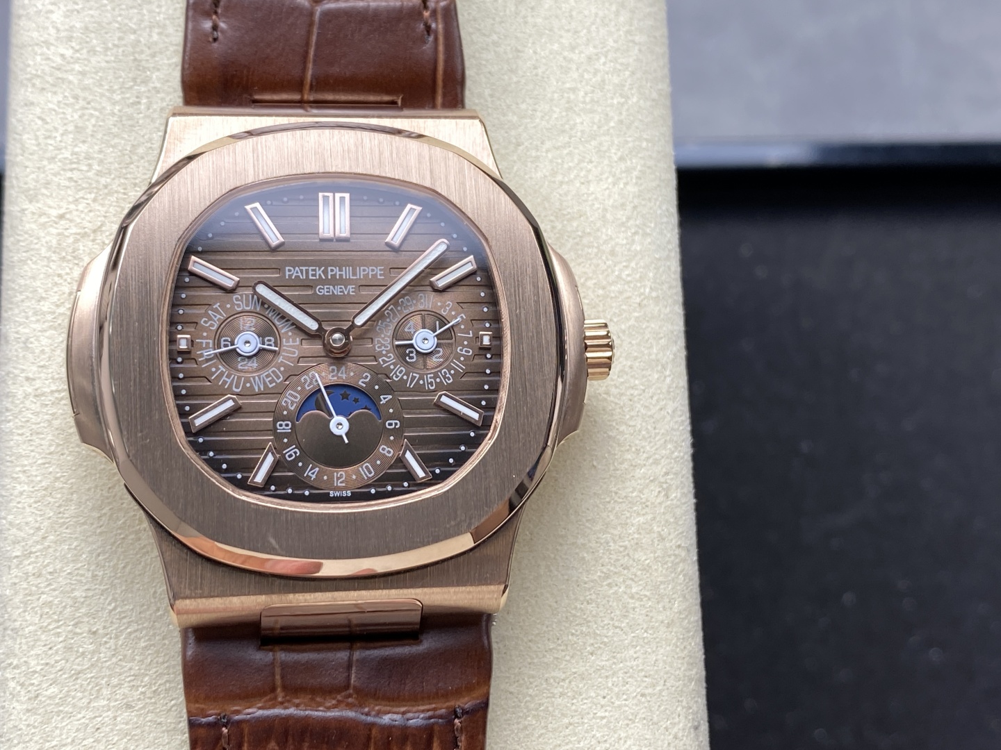 Patek Philippe 5740/1G-001- The super-complex multi-functional Nautilus, the first Nautilus complex wristwatch launched to date, is crafted with super-complex craftsmanship to create a casual sports watch. ?? 1 ? Small size, Big power: 40MM has all the following features: the year is shown in the left window position, the month in the right window position, the day of the week at 9 o 'clock, the month at 3 o 'clock, and a 24-hour and moon phase display at 6 o 'clock. 2 ? The movement is a replica Cal.240 automatic movement, which perfectly interprets the function while achieving a realistic appearance. 3 ? Master of Modification independent watchmakers, passionate participation in CUSTOM modification of dial color, adding interesting soul to one-in-a-kind watches!