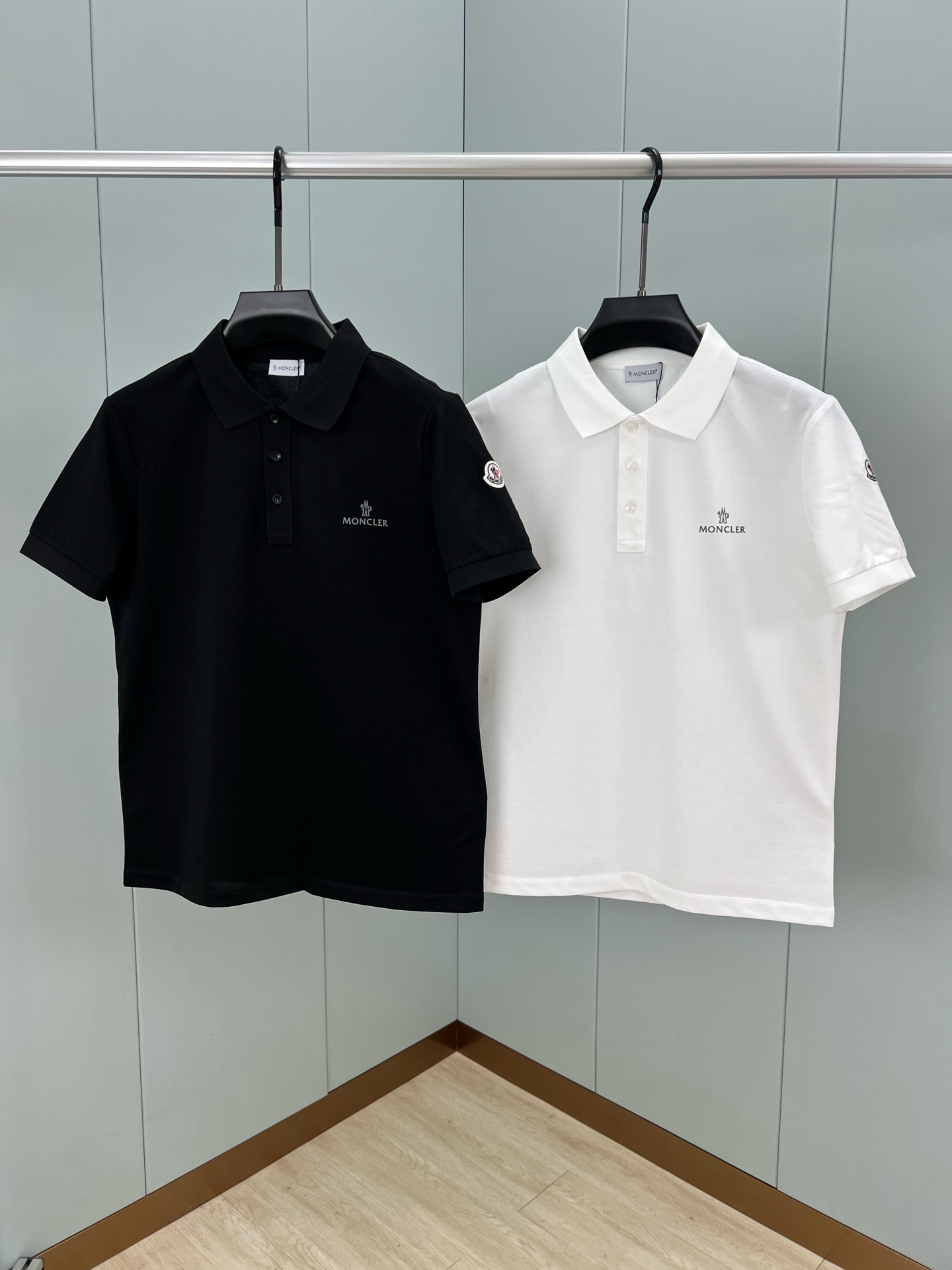Moncler's new Spring/Summer 25 grey letter-printed logo Polo shirt features a three-button lapel at the neckline and a classic felt-embroidered emblem on the left sleeve. It is made of custom-made 60-count double mercerized pearl cotton fabric. Black and white M ~ XXXL