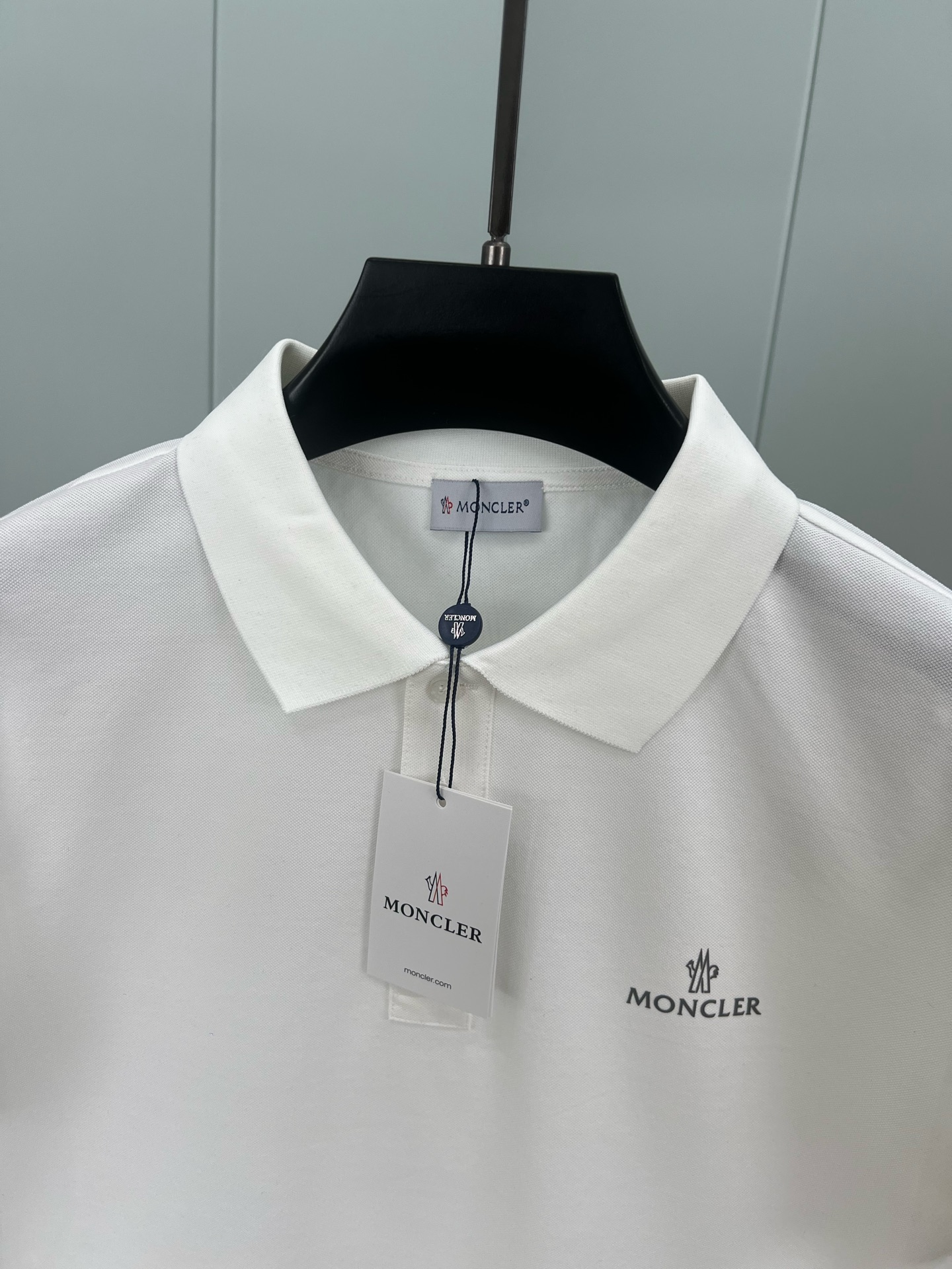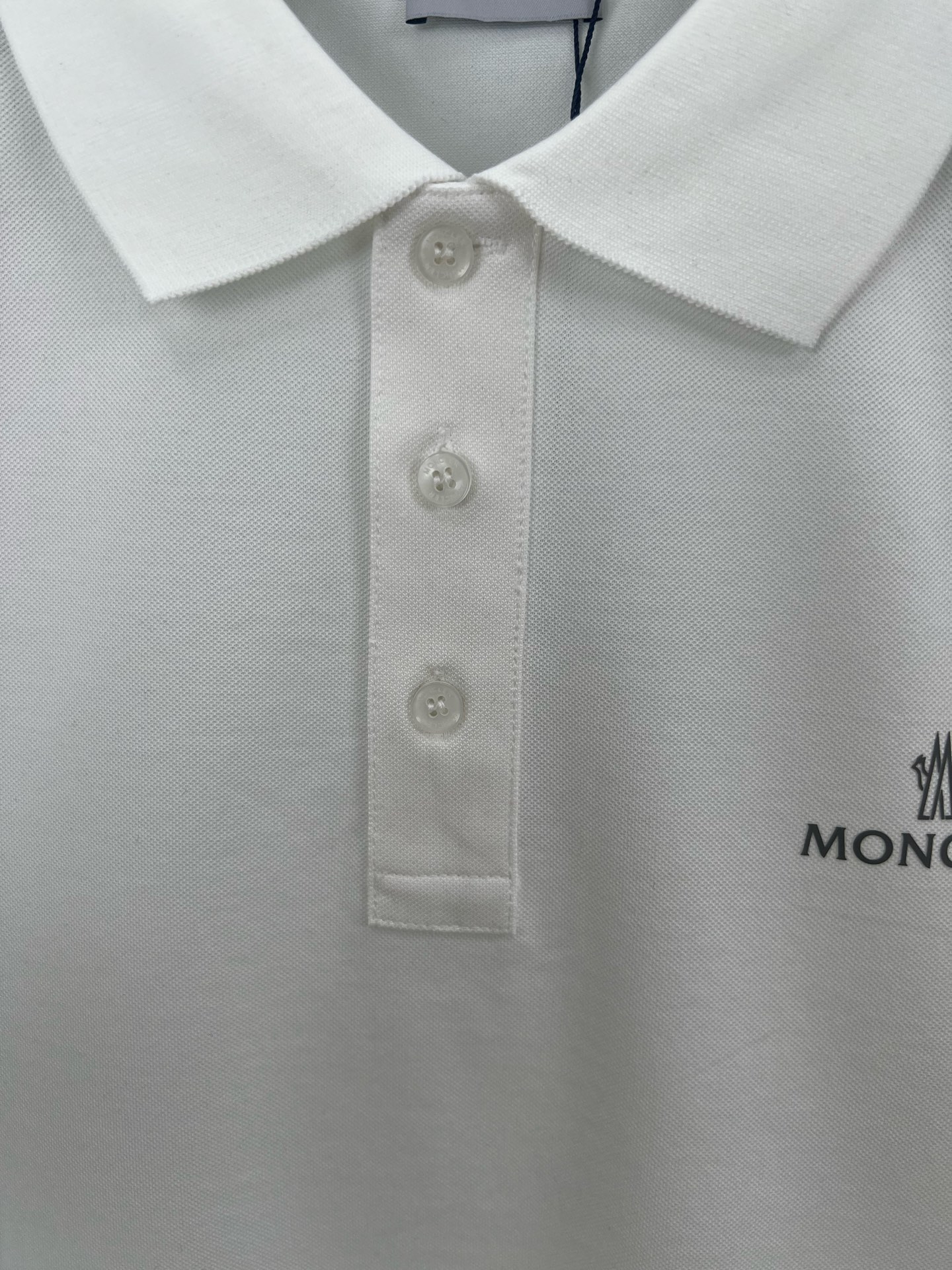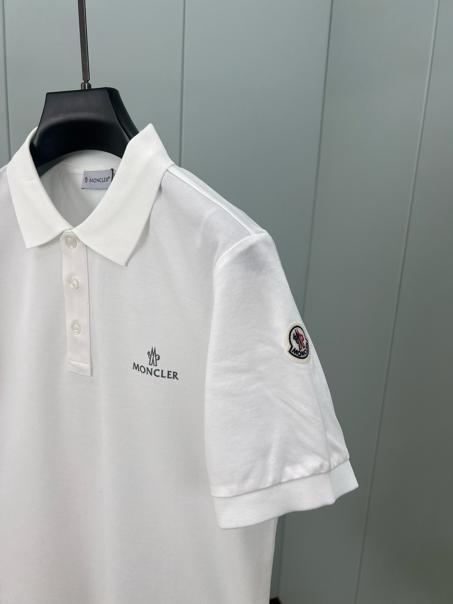 Moncler's new Spring/Summer 25 grey letter-printed logo Polo shirt features a three-button lapel at the neckline and a classic felt-embroidered emblem on the left sleeve. It is made of custom-made 60-count double mercerized pearl cotton fabric. Black and white M ~ XXXL