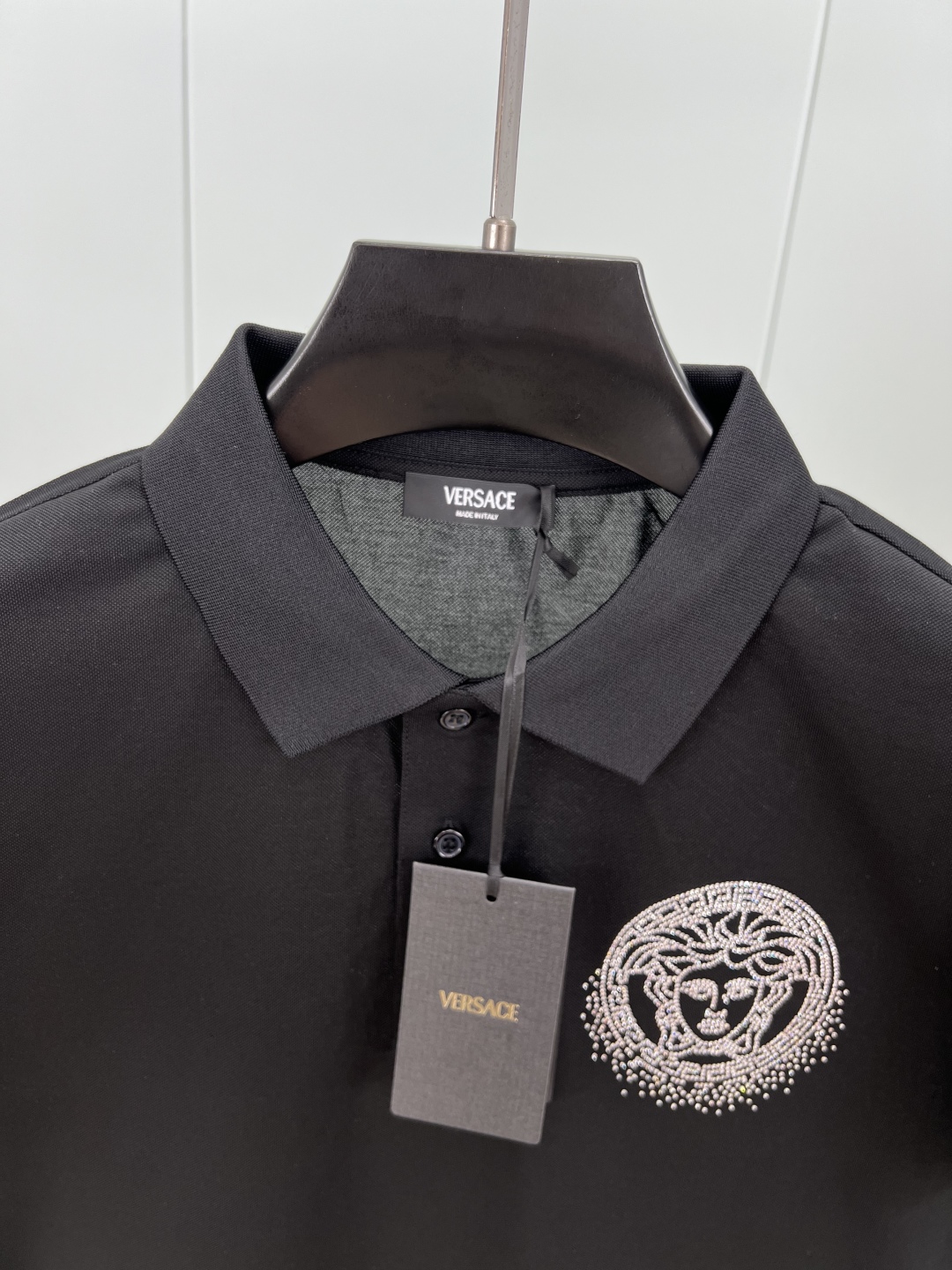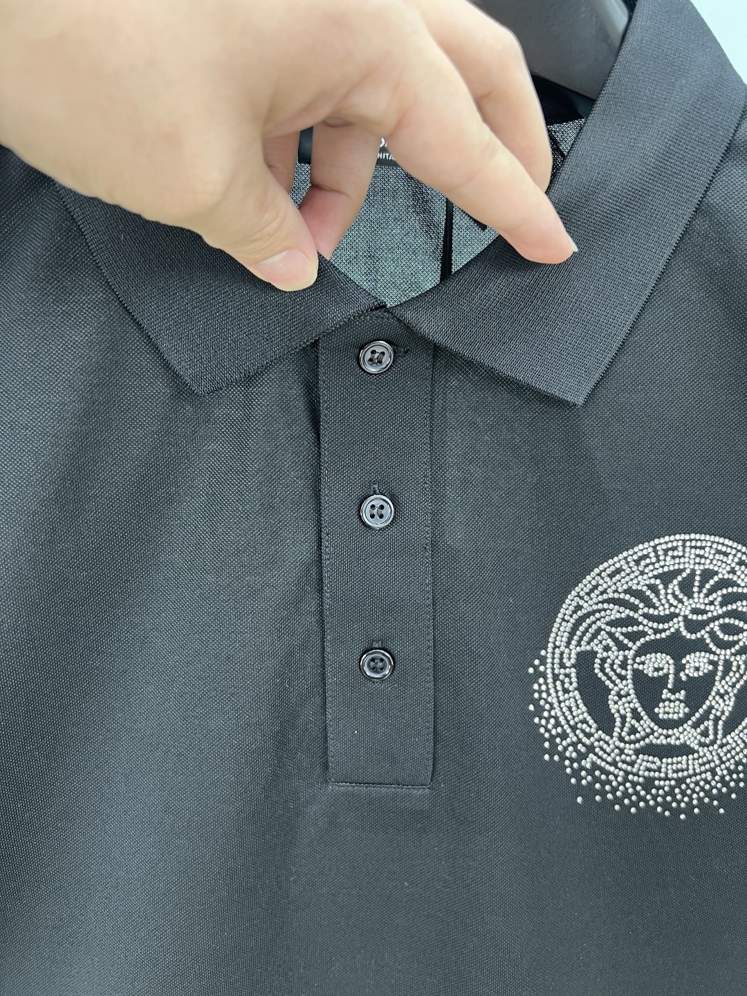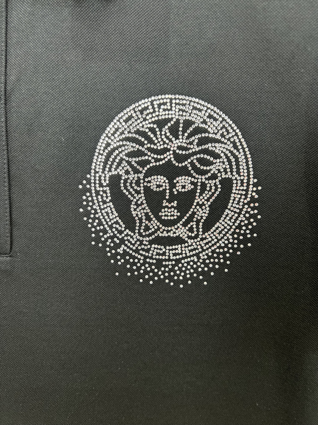 Versace Spring/Summer 25 new crystal Fading Medusa graphic Polo shirt, with a three-button front collar and a Fading Medusa Logo small crystal on the chest. Customized 60-count double mercerized pearl floor cotton fabric; Black and white M ~ XXXL