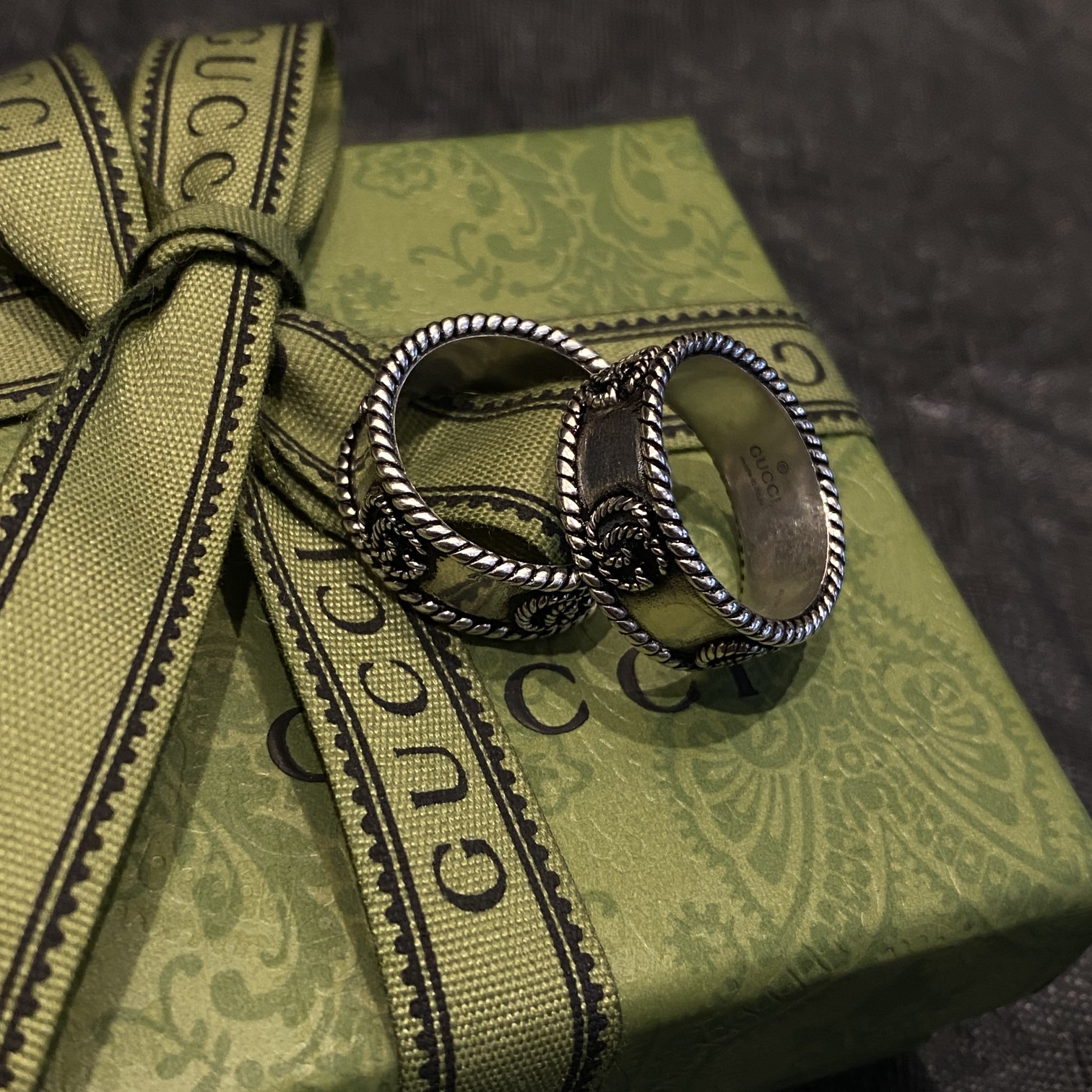 Youdaoplaceholder0 * Double G interlaced ring Aging effect The edge is decorated with engraved decorative strips, rolled decorative strips and double G rings This delicate Ring incorporates the brand's signature interwoven double G letter pattern into the twisted decorative strap design, Rings Ring
