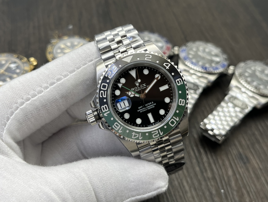 After years of accumulation, the Rolex Greenwich ll (with the cal3285 all-in-one) upgraded 12670 watch has made a stunning debut! Details: 1 ? Movement 3285 is a one-piece movement with a blue hairspring, the same as the original. The date function is adjusted by adjusting the fast jump of the hour hand. The GMT dual time zone hands are on the second layer above the bottom hour hand, in the order from bottom to top: hour - dual time zone hands - minutes - seconds. 2 ? pointer; The upgraded electroplated platinum can be seen from any Angle with its luster. It adopts a special needle tip process to ensure consistency with the original. The luminous powder is filled with imported Swiss blue-green luminous powder to perfectly restore the luminous effect! 3 ? dial; The original mold, three-dimensional printing, electroplating, platinum center axis, sunken calendar, font size and color are exactly the same as the original, including the polishing of the four corners of the bars and the 12-character crater polishing, all of which are highly consistent! 4 ? rim opening; The soul of this watch is also where our factory has spent a great deal of time and effort. Every firing is a progress. Our factory's bezel is formed in one piece with high-precision ceramic bezels. The color difference must be minimized. The deep blue and black bezel, red and blue bezel, black bezel, and genuine ceramic are all filled with white gold. Its color is currently the closest to the original! 5 ? calendar; The new Rolex calendar adopts a new hook 4. Factory C has drawn on it to avoid many incorrect versions in the market. The font printing on the calendar is very clear and three-dimensional. Even when magnified ten times, it remains clear and three-dimensional without any jagged teeth! 6 ? case and strap; The 904L steel casting blank is selected and formed through repeated manual grinding. 904L steel has the advantages of low density, strong corrosion resistance, scratch resistance and wear resistance. The overall impression exudes a sense of understated luxury! CLEAN Factory2024, a masterpiece of craftsmanship, interprets classics and achieves excellence. Welcome all watch enthusiasts to appreciate!