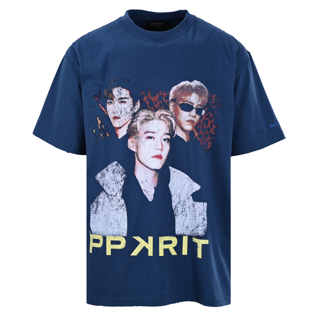 Local pick-up BALENCIAGA BLCG collaboration ppkritt Celebrity Portrait short-sleeved T-shirt Custom-woven and custom-dyed 32-count double yarn 260-gram all-cotton combed sweat fabric, multiple color adjustments perfectly restore the original consistent very high-end deep blue and royal blue. The character details are depicted with the r brush + Belgian imported Conley direct printing technology, multiple modifications and adjustments, the aging dots on the character's face are basically over 95%, very clear printing and cracked texture, the cuffs are embroidered The embroidery thread and fabric are in the same tank. The signature print on the back is made by traditional hand-screen printing, with loose cutting. The original pattern is not cut at all. After leavening and washing, the edges are hand-ground. There are many details, and it is very heavy and beautiful Size: XS-M