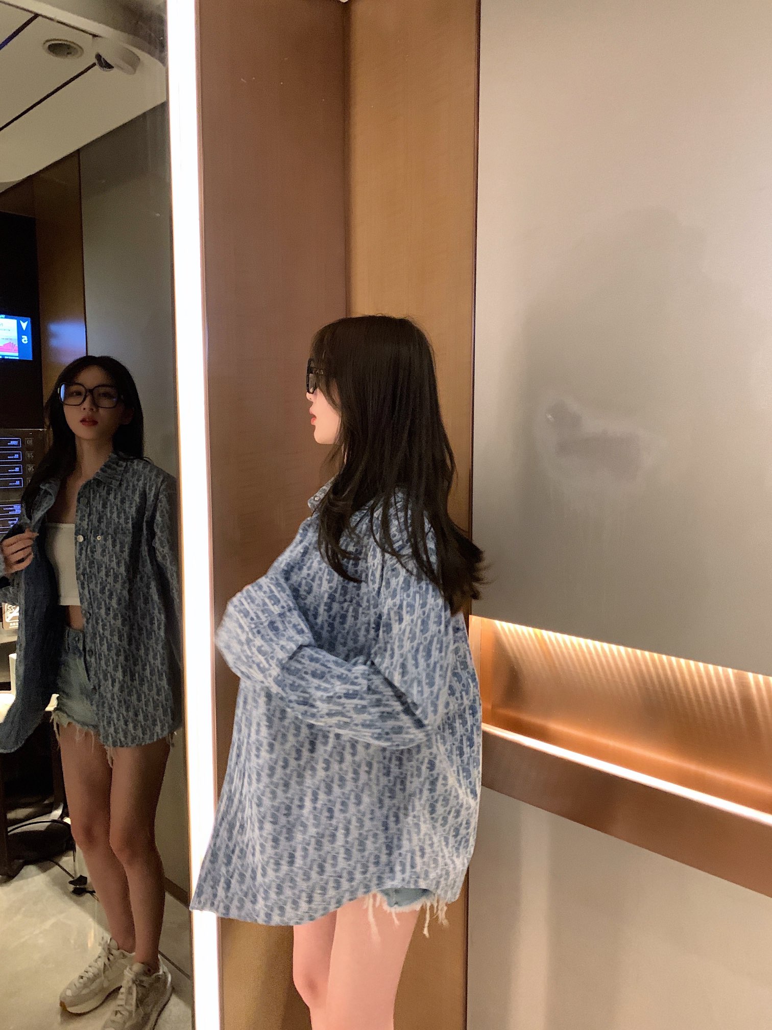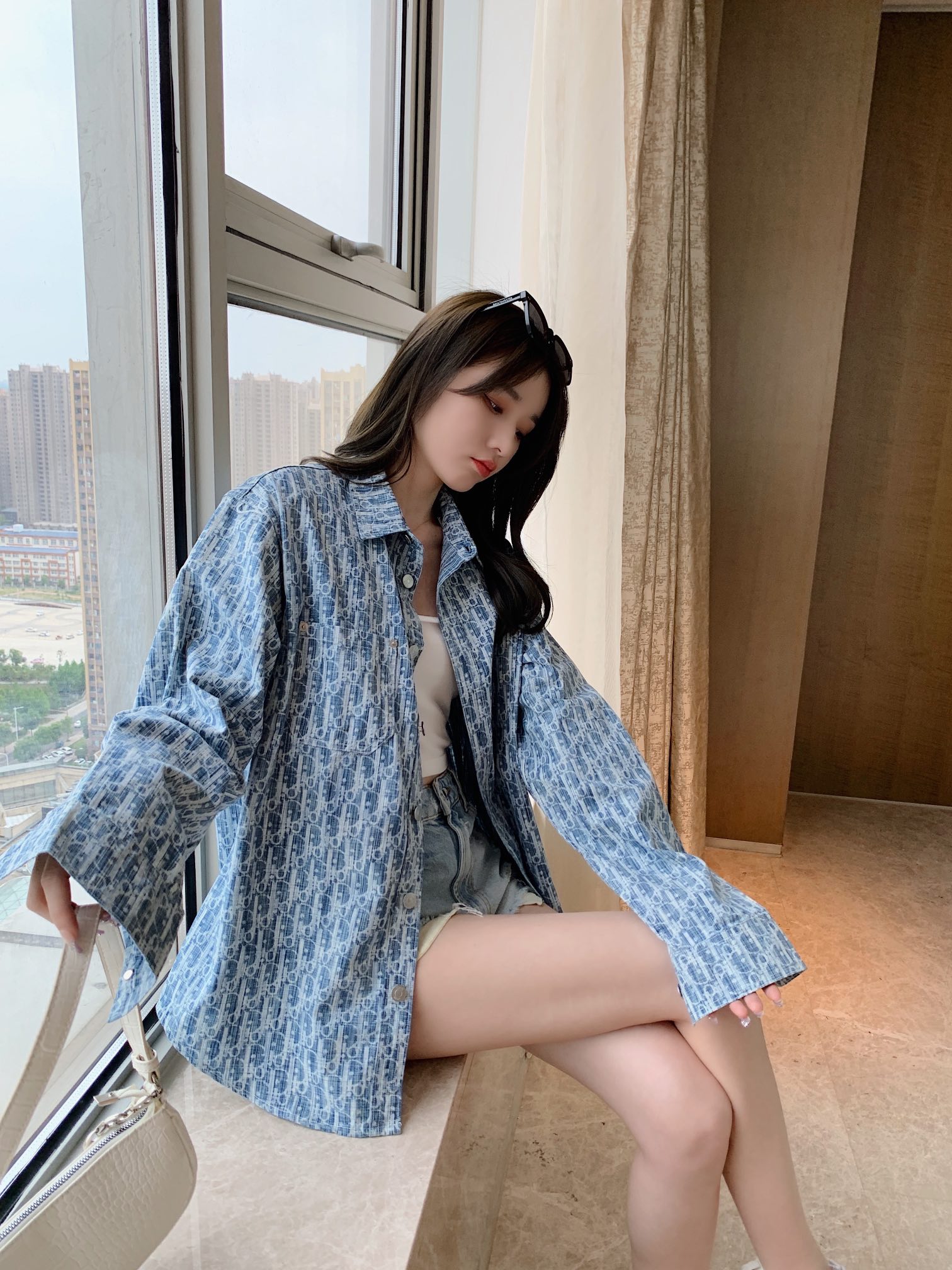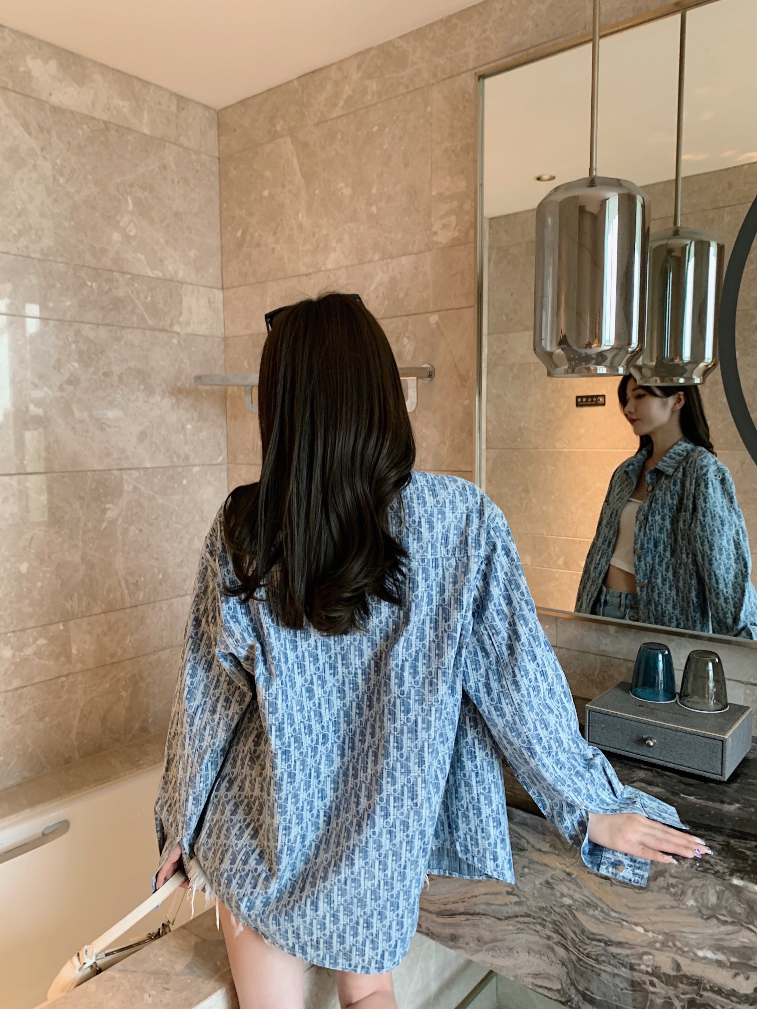 The effect of wearing a long-sleeved jacquard denim shirt with the Dior logo in full print #