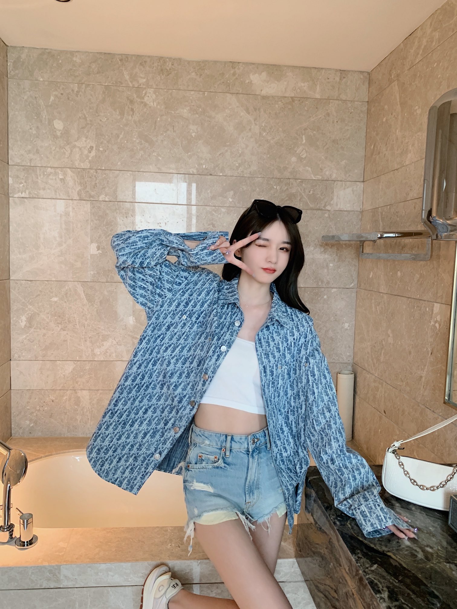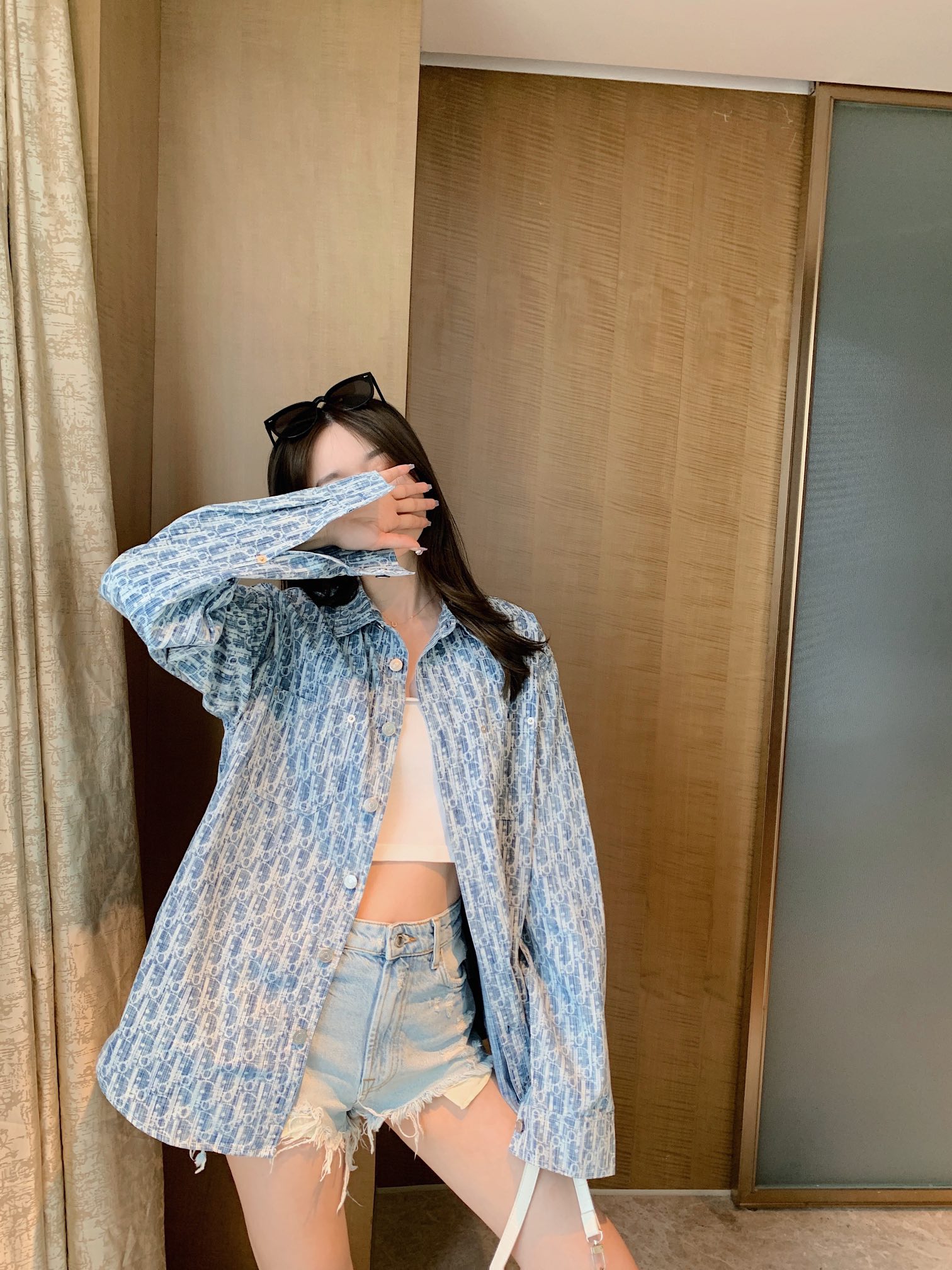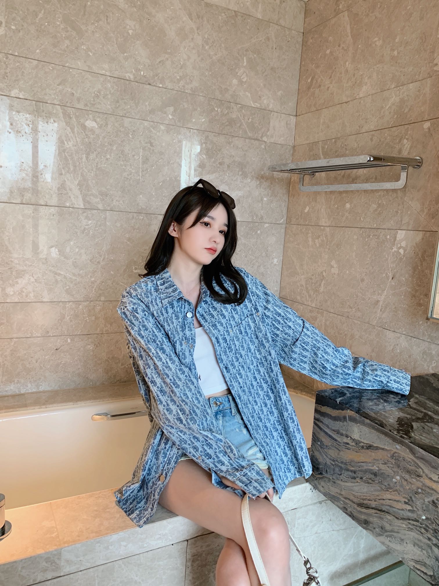 The effect of wearing a long-sleeved jacquard denim shirt with the Dior logo in full print #
