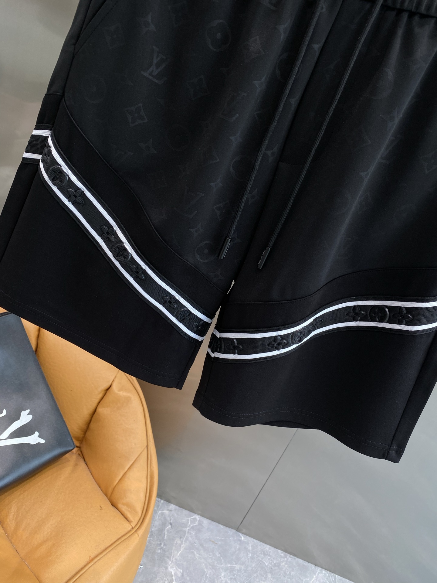 ?????????? the Donkey family LV black shorts, with a pure black base tone, are steady and grand. They are subtly decorated with the classic LV Monogram pattern, and the white line design on the side adds a sense of fashion and layering to the overall look. The elastic waist with drawstring is convenient and comfortable, M-3XL