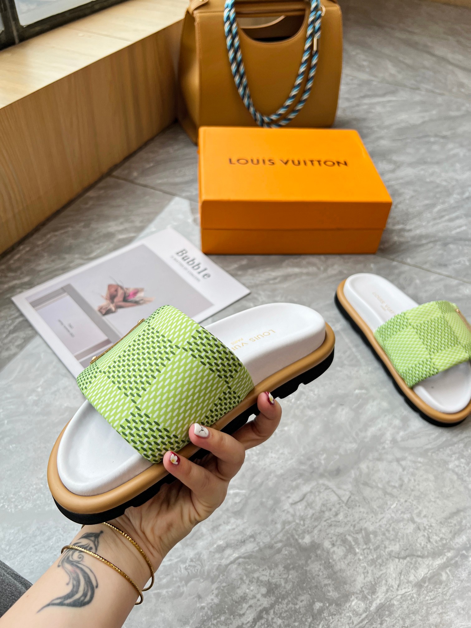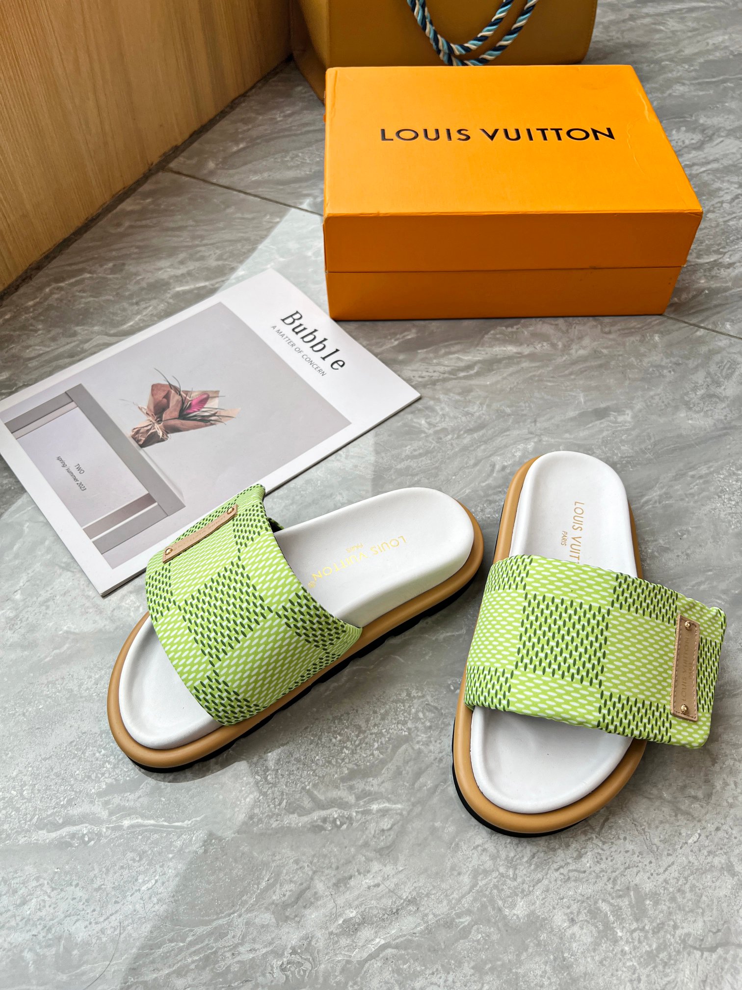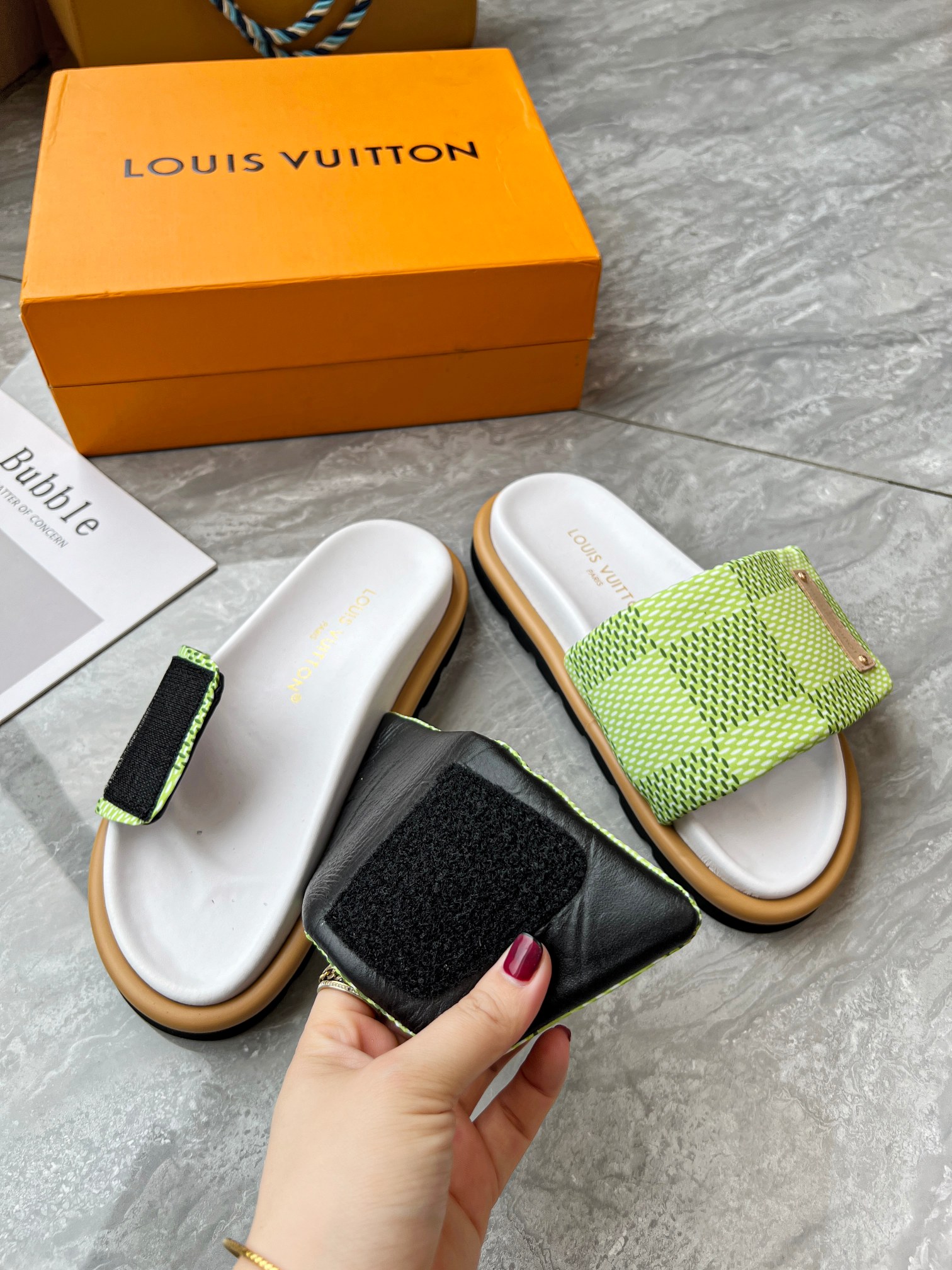Style #2004??????. L Donkey L Family's best-selling embossed logo patterned flip-flops. This Pool Pillow Comfort flat-bottomed flip-flops is made of technological fabric and reinterprets the Monogram pattern with high-frequency embossing technology. Soft padded upper with adjustable Velcro, comfortable and resilient insole with harmonious color ?? Fabric: Original custom tech fabric ?? Lining: Soft sheepskin ?? Sole: original molded rubber foam outsole ??Size: 35-44 (45.46.47)