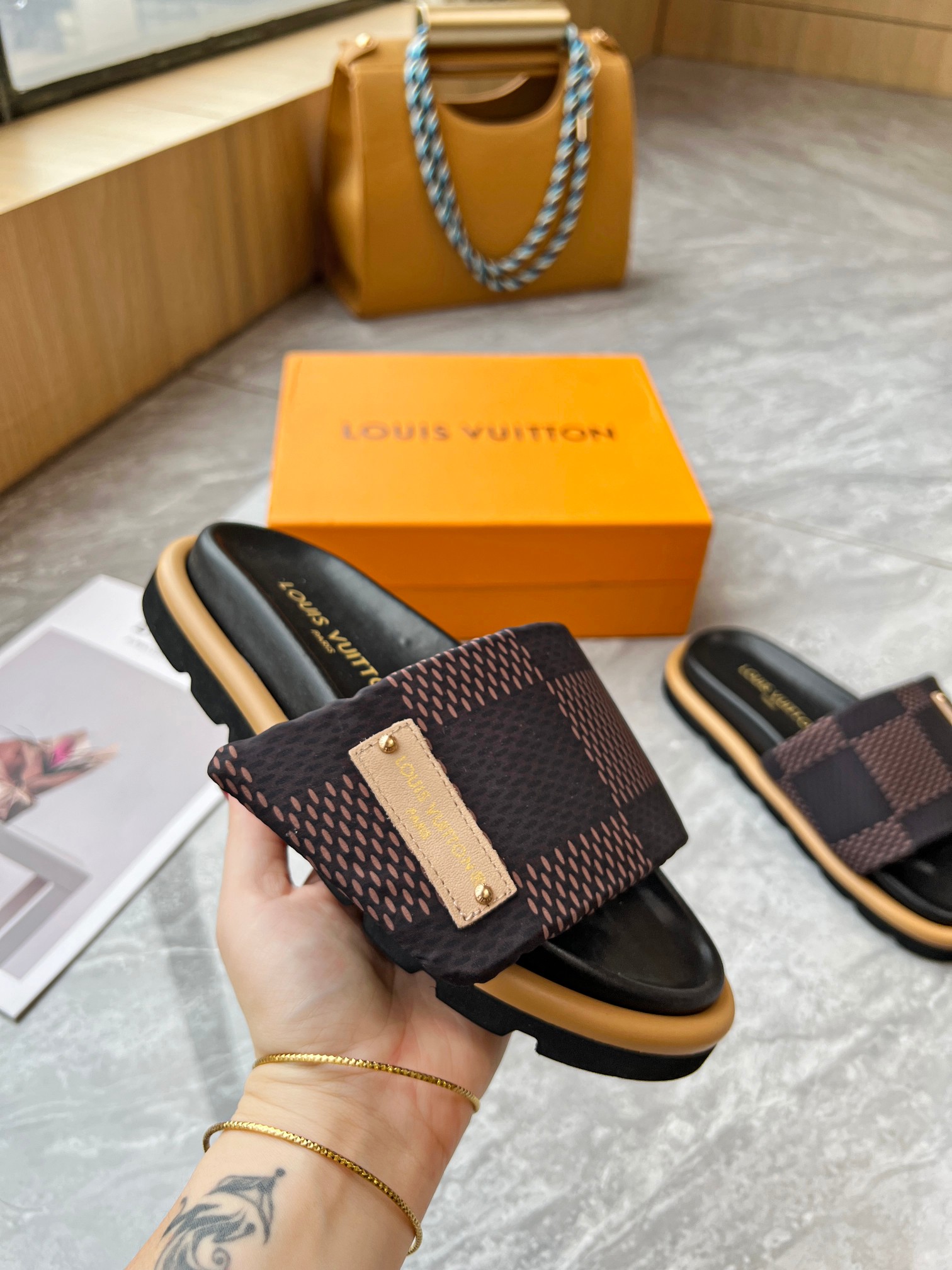 Style #2004??????. L Donkey L Family's best-selling embossed logo patterned flip-flops. This Pool Pillow Comfort flat-bottomed flip-flops is made of technological fabric and reinterprets the Monogram pattern with high-frequency embossing technology. Soft padded upper with adjustable Velcro, comfortable and resilient insole with harmonious color ?? Fabric: Original custom tech fabric ?? Lining: Soft sheepskin ?? Sole: original molded rubber foam outsole ??Size: 35-44 (45.46.47)
