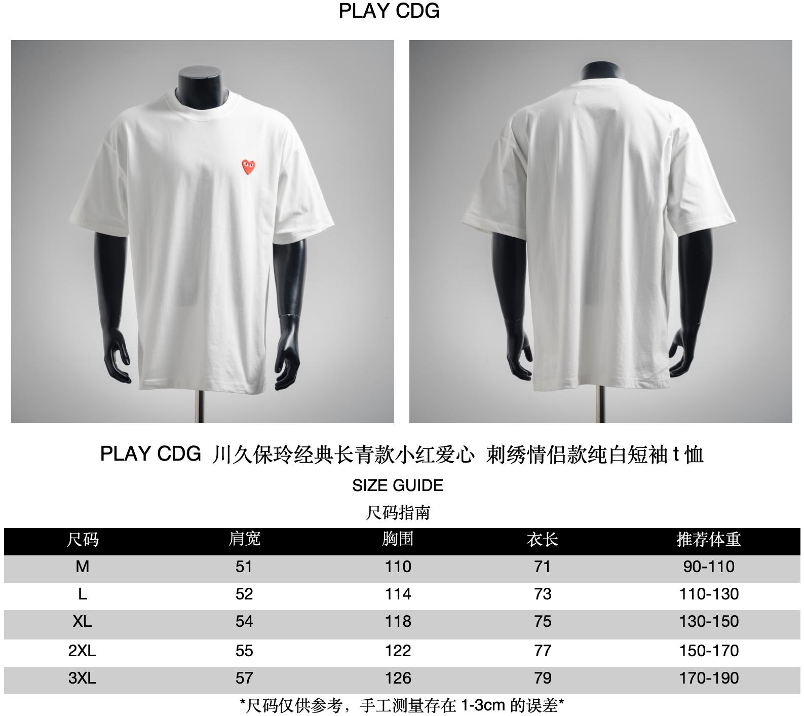 PLAY CDG Rei Kawakubo Classic Evergreen Little Red heart-shaped embroidered Couple's pure white short-sleeved T-shirt size recommendation