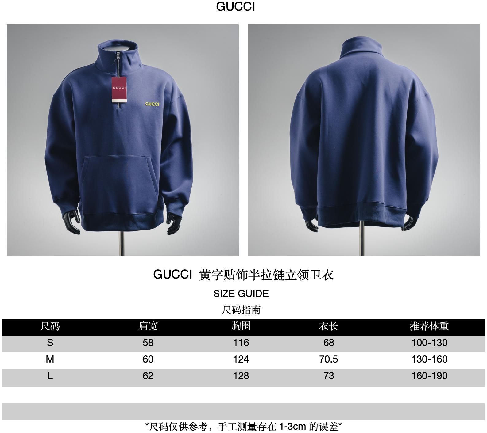 GUCCI GUC yellow lettered half-zipper stand-up collar hoodie size recommendations
