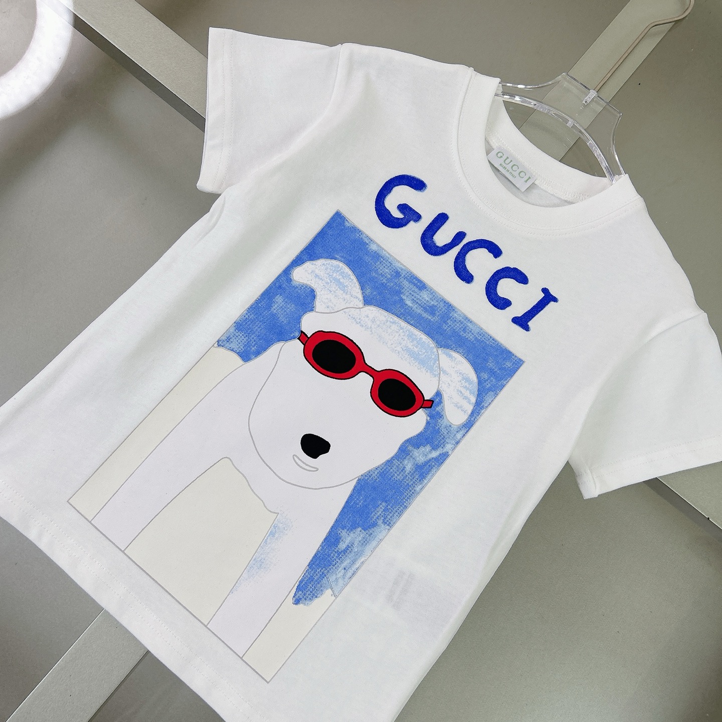 Gucci Gucci, high-end children's wear, private T-shirt, cotton fabrics, glasses before and after the dog ?? logo design printing and code number: 100/110/120/130/140/150/160 cm