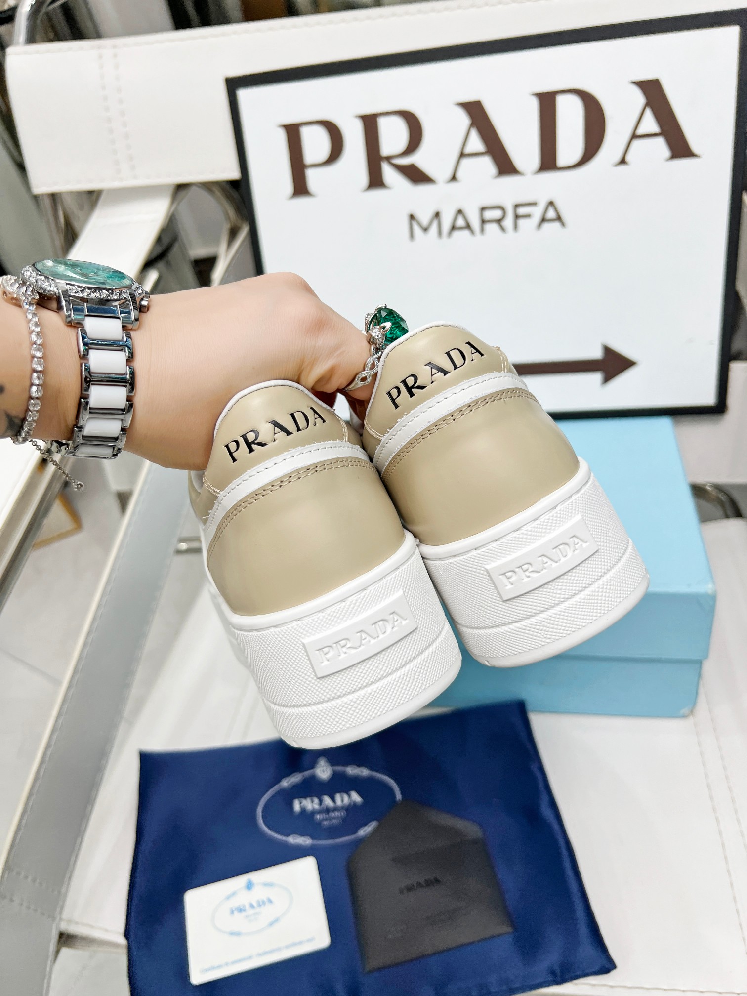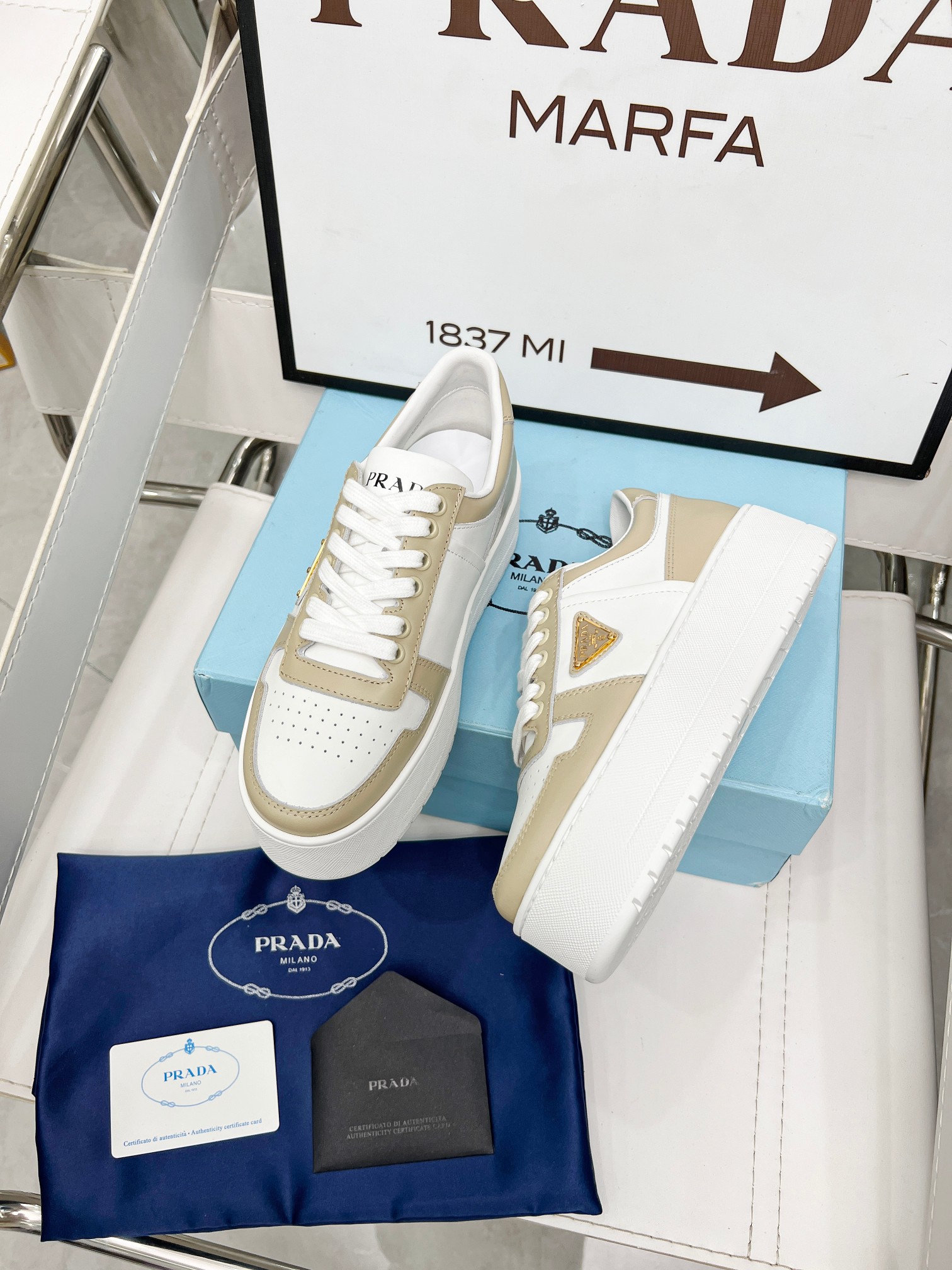 ???? Prada Prada "Panda color" thick soles white sneakers Casual sneakers This sneaker continues the timeless silhouette and elevates the style with a light design, featuring a triangular buckle logo and a 5CM thick sole Suitable for all seasons, it can be paired with various casual looks. In an era when all kinds of styles are eye-catching, the white sneakers are the ones that can last the longest and gradually capture people's hearts. Leather material: Original edge-cut beads + calfskin combination Inside: Inside the sheepskin Shoe label: Enamel-coated triangular metal logo Size :34-41