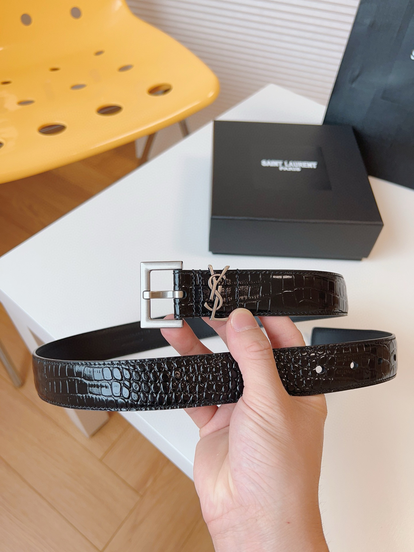 YSL Saint Laurent crocodile pattern top-quality calfskin soft belt 3.0cm square needle copper buckle CASSANDRE logo belt ring